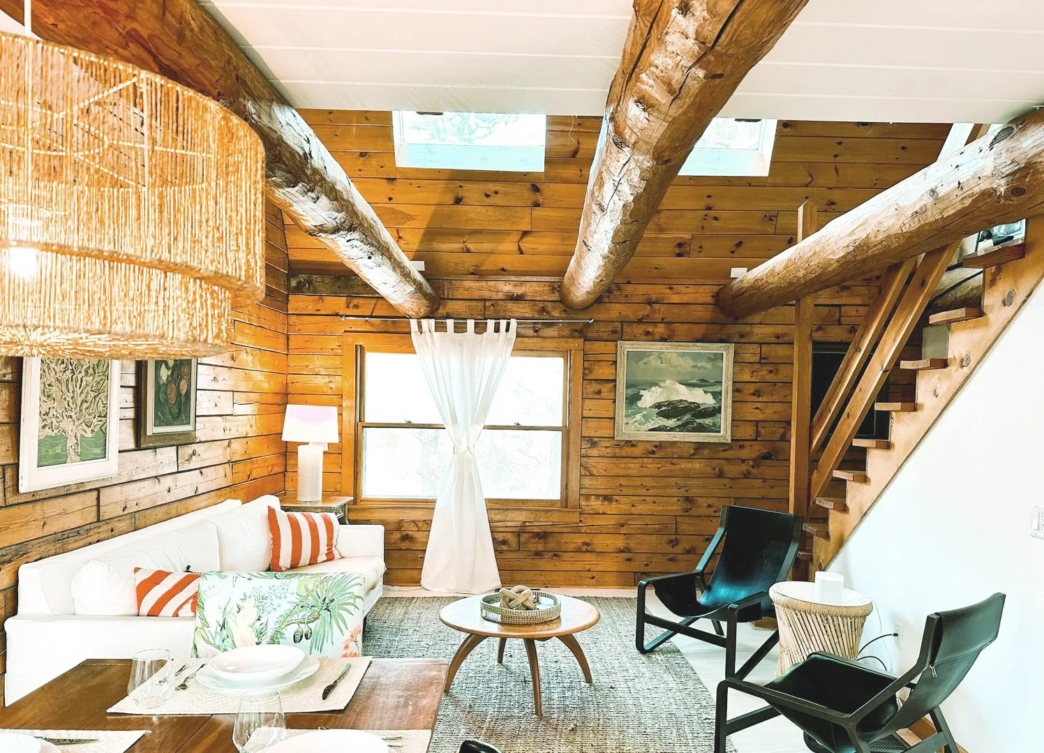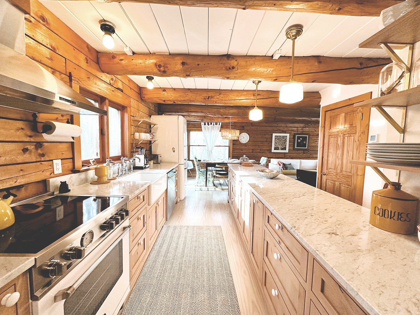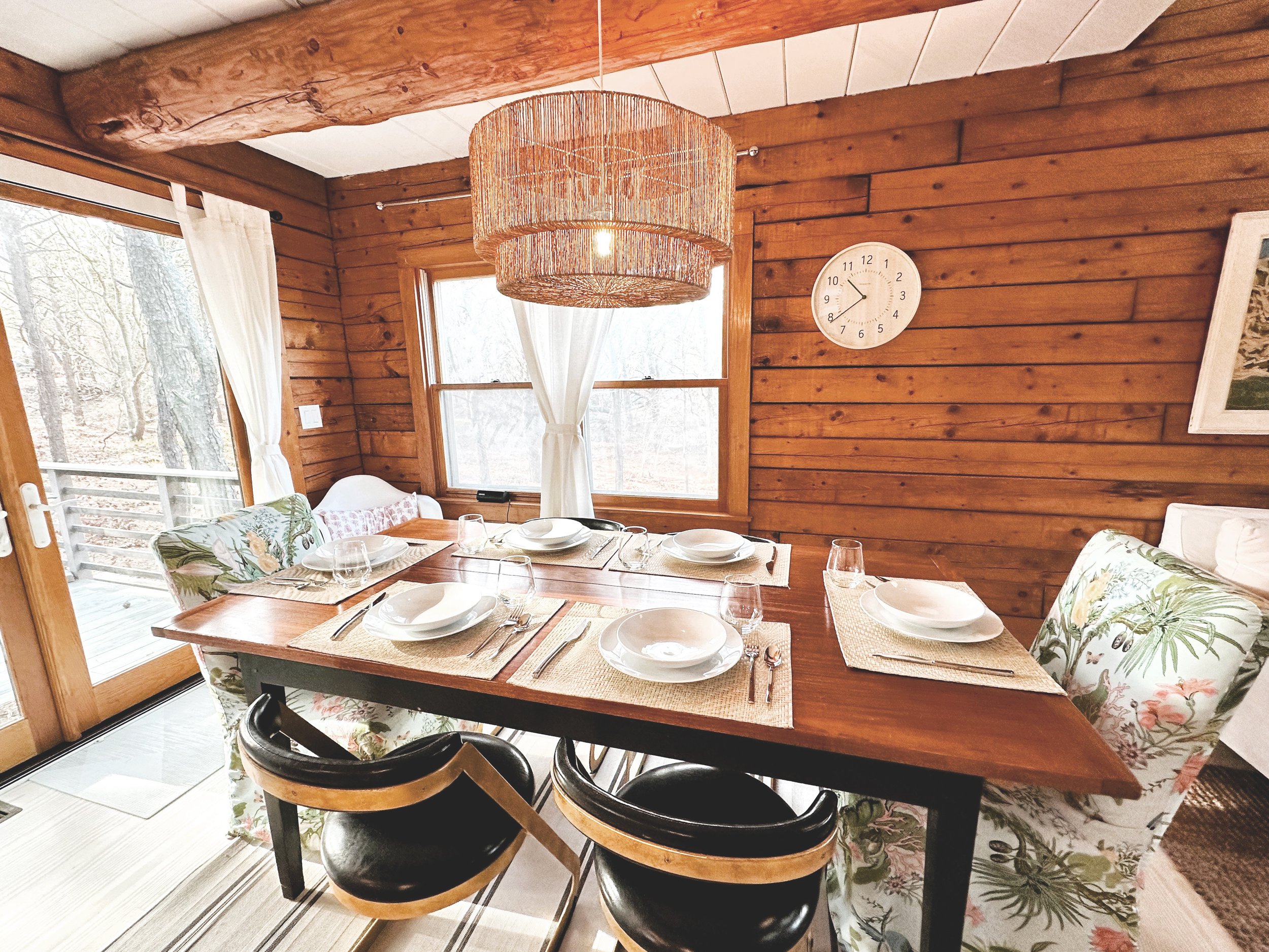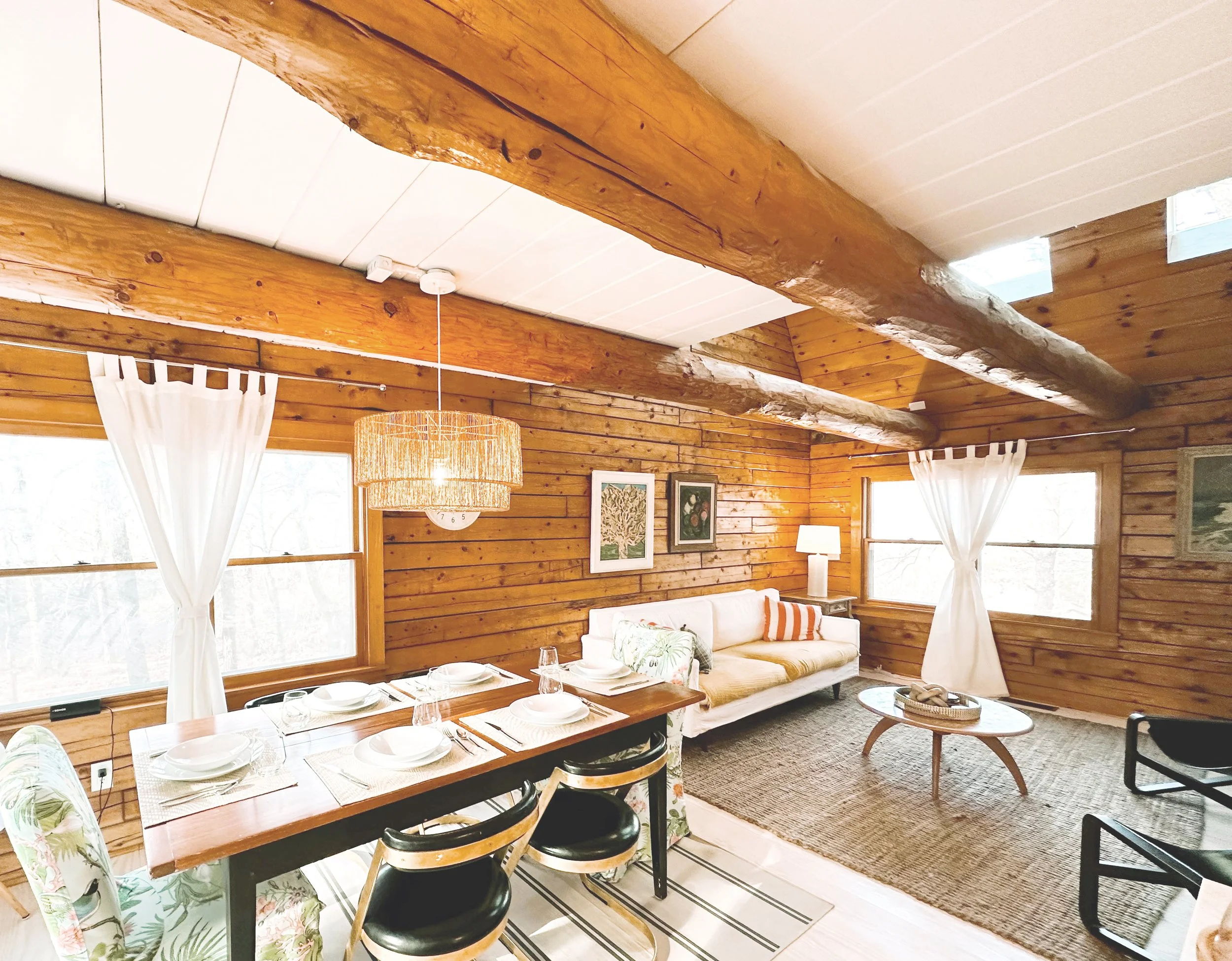 This project involved a complete redesign of a cabin in Wellfleet, MA. The kitchen was entirely gutted and renovated. We replaced the bright red shag carpet with whitewashed wood floors, which beautifully contrast the original wood beams. To further brighten the space, the ceilings were painted white, and all lighting fixtures were replaced.